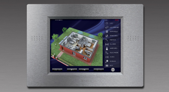 The use of the Allumia Touch front plates extends to the home automation system: our innovative solutions make life easier, guarantee safety, comfort and save energy. The elegant and sophisticated touchscreen with a brushed aluminium front plate enables the control of all electrical system functions in your home or office with just one simple touch: control of illumination, shutter, anti-burglary system, temperature, water and gas leak alarm, sound system, as well as energy, water and gas consumption.